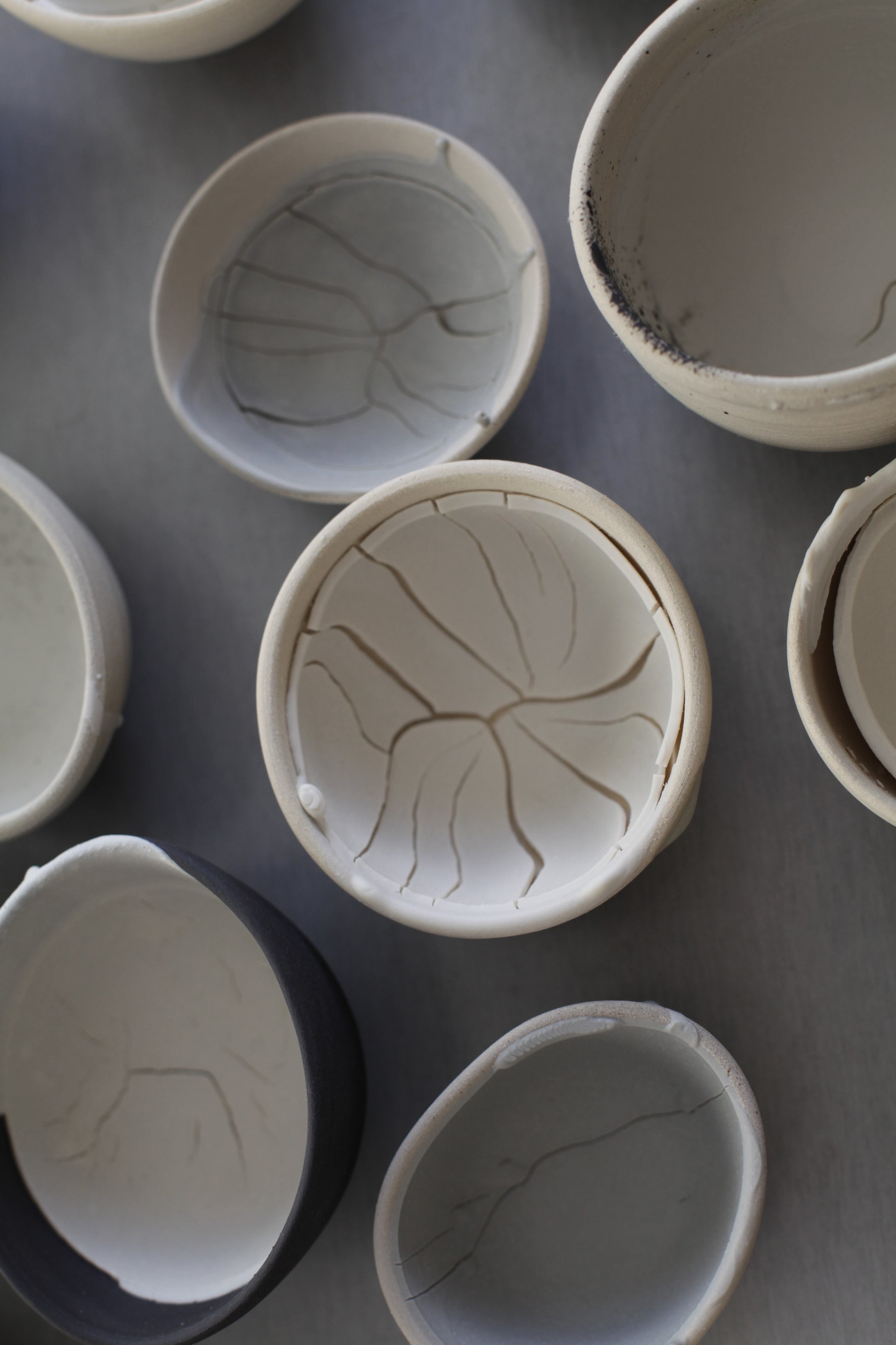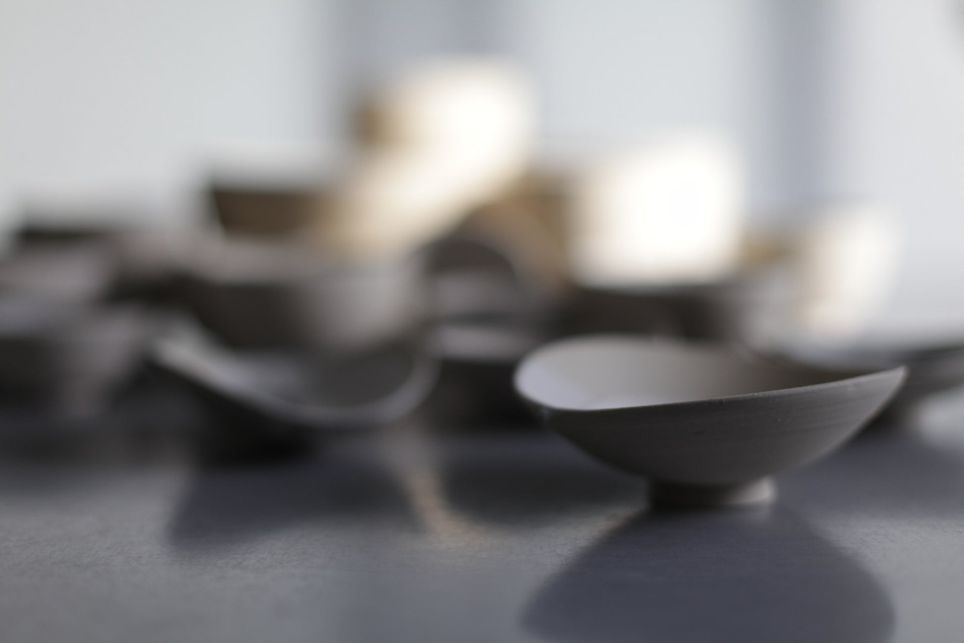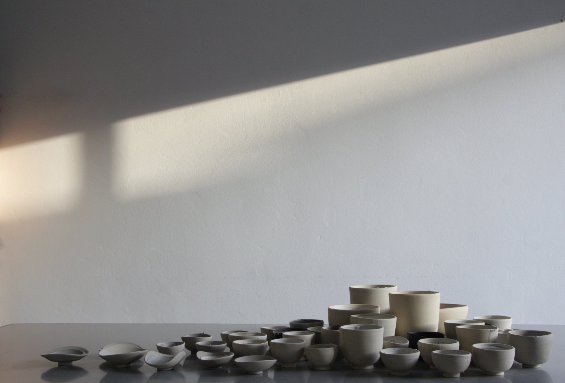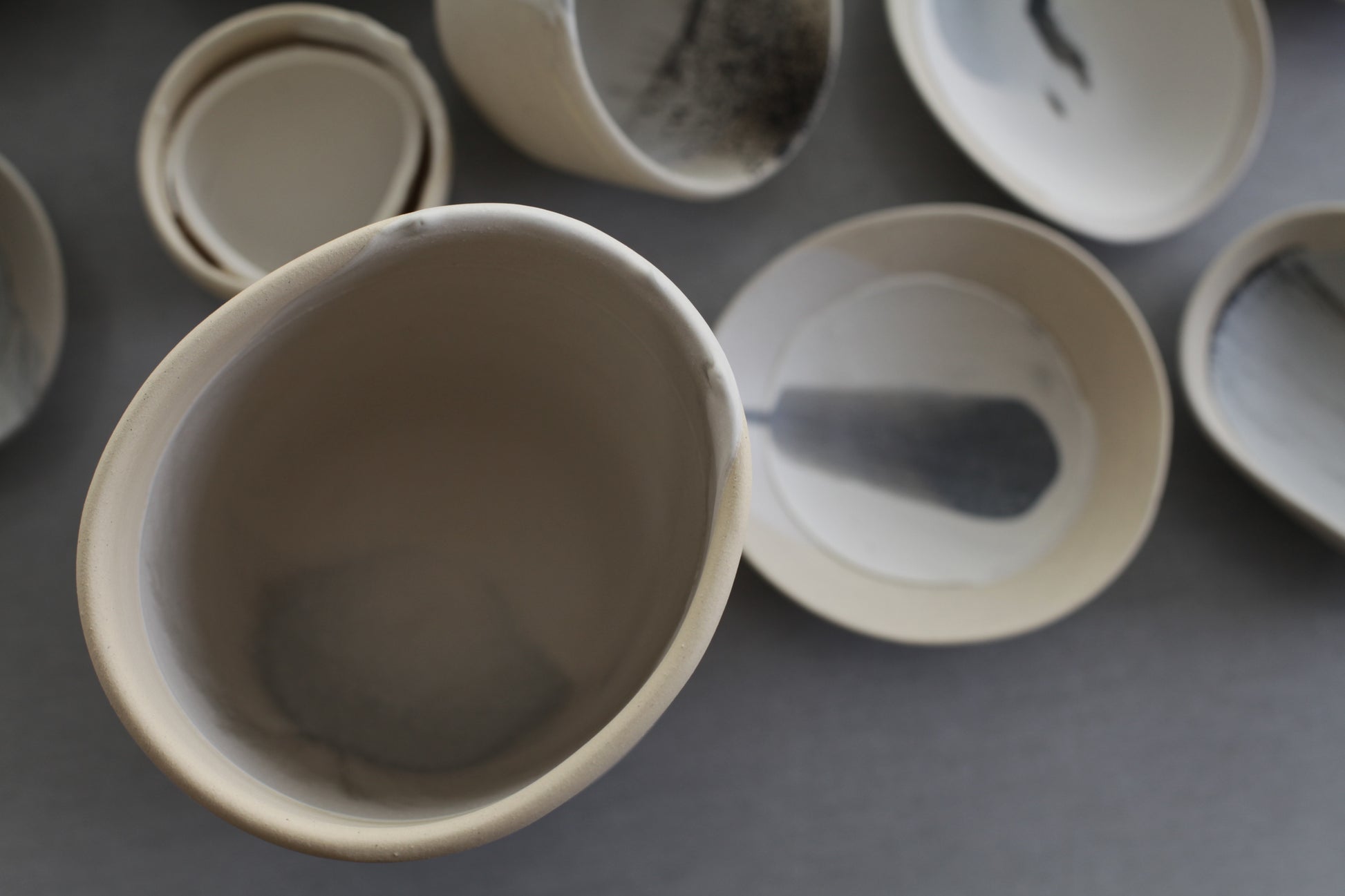 An extraordinary assemblage of 38 artisanal bowls born from rigorous material experimentation in 2017. Crafted through wheel-throwing techniques in both stoneware and porcelain, this collection documents a refined investigation into how these two clay bodies interact and transform. The resulting pieces showcase sophisticated surface treatments—intricate textures, deliberate fracturing, and gestural black staining that evoke abstract landscapes. Each vessel, distinct in form and proportion, functions as both functional object and contemplative artwork. This installation-scale collection represents a singular moment of artistic inquiry, celebrating the dialogue between control and spontaneity inherent in ceramic practice. You receive the complete pictured ensemble.